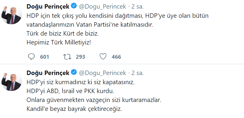 Perinçek, Demirtaş’ın bu sözlerine cevap vererek, “HDP'yi siz kurmadınız ki siz kapatasınız. HDP'yi ABD, İsrail ve PKK kurdu. Onlara güvenmekten vazgeçin sizi kurtaramazlar. Kandil'e beyaz bayrak çektireceğiz.” İfadelerini kullandı.