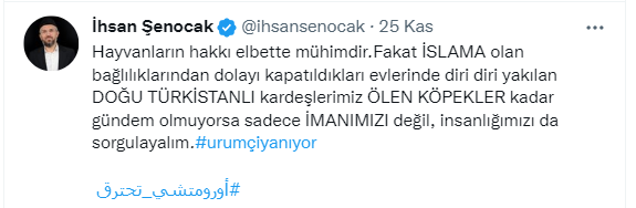 Dr. Şenocak, "Hayvanların hakkı elbette mühimdir. Fakat İslam’a bağlılıklarından dolayı kapatıldıkları evlerinde diri diri yakılan Doğu Türkistanlı kardeşlerimiz ölen köpekler kadar gündem olmuyorsa sadece imanımızı değil, insanlığımızı da sorgulayalım." dedi.