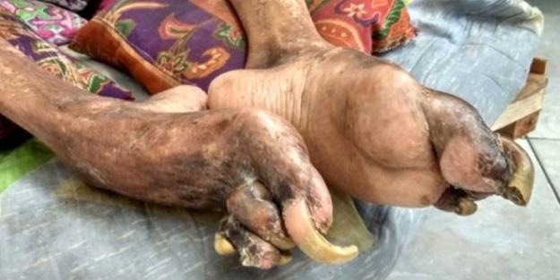 Beyninde oluşan hasar nedeni ile felç olan ve yatalak kalan adamın bacakları yuvarlak şekil alırken parmak uçları çürüyüp odunlaşmaya başladı.