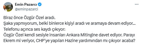 Emin Pazarcı "Biraz önce Özgür Özel aradı. Şaka yapmıyorum, belki binlerce kişiyi aradı ve aramaya devam ediyor... Telefonu açınca ses kaydı çıkıyor: