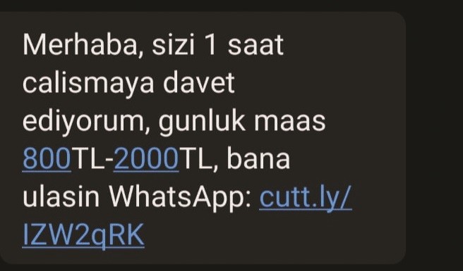 Şimdi de vatandaşların şahsi telefonlarına kısa mesaj atan sahtekârlar insanları 1 saat çalışma karşılığında 800 ile 2 bin TL ödeme yapmak koşuluyla sahte internet adreslerine yönlendiriyor. Dolandırıcılar tarafından atılan kısa mesajda, "Merhaba, sizi 1 saat çalışmaya davet ediyorum, günlük maaş 800-2000TL, bana ulaşın Whatsapp: cutt.ly/IZW2qrk" ifadeleri kullanılıyor. Linke tıklayanların kimlik bilgileri farklı uygulamalarla kopyalanıyor. Uzmanlar bu tür mesajlardaki linklere tıklanmadan, hatta mesajların okunmadan silinmesi gerektiği uyarısında bulunuyor.