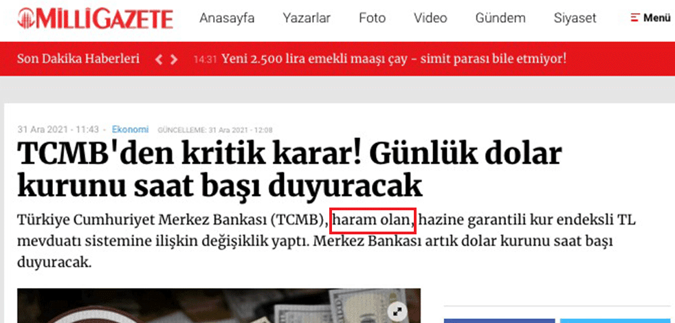 Dün, "Nas istismar ediliyor." algısına hizmet eden Milli Gazete, işler değişince, haramı hatırlayarak, TCMB'nin dolar kuru kararını, "Türkiye Cumhuriyet Merkez Bankası (TCMB), haram olan, hazine garantili kur endeksli TL mevduatı sistemine ilişkin değişiklik yaptı. Merkez Bankası artık dolar kurunu saat başı duyuracak." ifadeleri ile haberleştirdi.