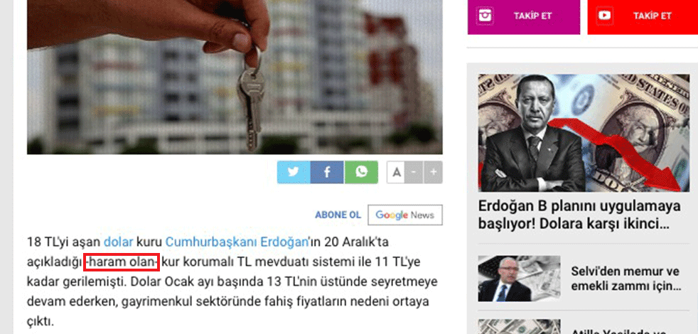 "18 TL'yi aşan dolar kuru Cumhurbaşkanı Erdoğan'ın 20 Aralık'ta açıkladığı -haram olan- kur korumalı TL mevduat sistemi ile 11 TL'ye kadar gerilemişti. Dolar Ocak başında 13 TL'nin üstünde seyretmeye devam ederken, gayrimenkul sektöründe fahiş fiyatların sebebi ortaya çıktı.