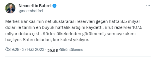 Batırel yaptığı açıklamada, "Merkez Bankası’nın net uluslararası rezervleri geçen hafta 8.5 milyar dolar ile tarihin en büyük haftalık artışını kaydetti. Brüt rezervler 107.5 milyar dolara çıktı. Körfez ülkelerinden görülmemiş sermaye akımı başlıyor. Satın dolarları, kur kalesi yıkılıyor" dedi.
