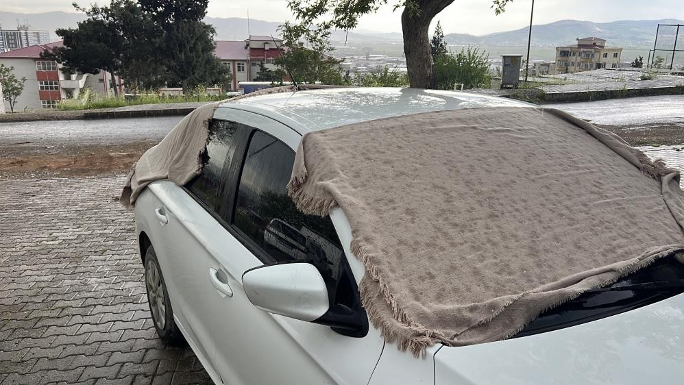 Kahramanmaraş'ta etkili olan dolu yağışı vatandaşları harekete geçirdi; arabaların üstüne yorgan ve kilim seren Maraşlılar araçlarının zarar görmesini engellemeye çalıştı.