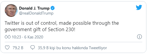 ABD Başkanı Donald Trump sosyal medyadan yaptığı açıklamada, paylaşımlarına gelen sansüre değinerek "Twitter, 230'uncu kısım hükümetin armağanı sayesinde kontrolden çıktı!" dedi.