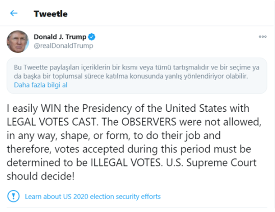 ABD seçim sonuçları merakla beklenirken Twitter'dan ABD Başkanı Donald Trump'a yönelik sansür uygulamaları gelmeye devam ediyor. Edinilen son dakika habere göre; Trump, Twitter'in sansür uygulamalarına tepki gösterdi.