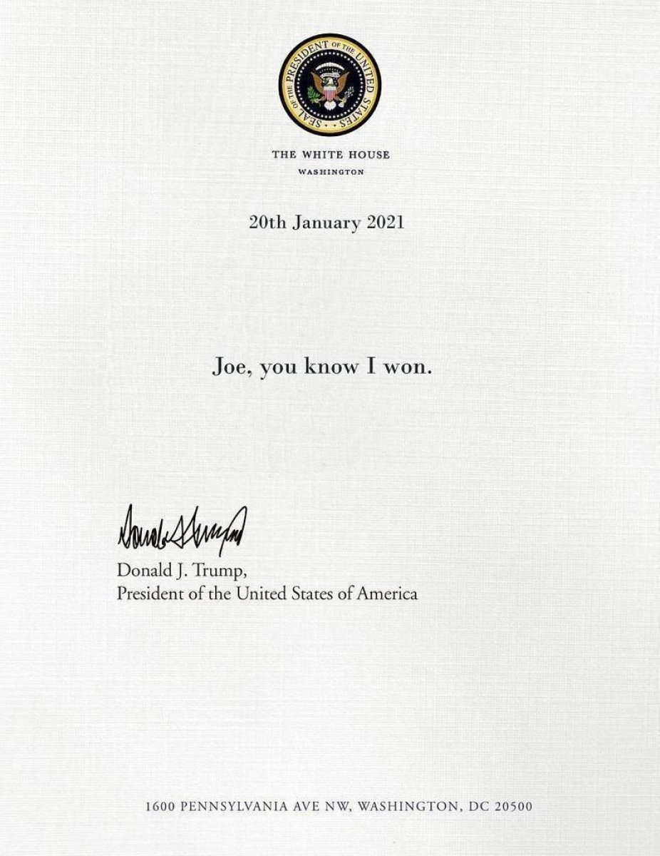 Sosyal medyada dolaşıma giren bir mektup görüntüsüne göre, Trump'ın, halefi için "Biliyorsun Joe, ben kazandım." dediği iddia edildi.