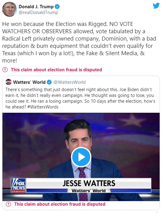 ABD Başkanı Donald Trump tweetinde seçimi hileyle kaybettiğini, seçim gözlemcilerine faaliyetlerini yerine getirmesi için izin verilmediğini ifade etti. Trump bu tweeti ile ilk defa Joe Biden'ın seçimleri kazandığını söylemiş oldu.