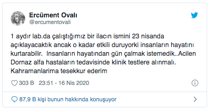 Koronavisüsün ilacı bulundu mu? Dünyanın gözü kulağı bu sorunun cevabında. 1 aydır lab.da çalıştığımız bir ilacın ismini 23 nisanda açıklayacaktık ancak o kadar etkili duruyor ki insanların hayatını kurtarabilir. İnsanların hayatından gün çalmak istemedik. Acilen Dornaz alfa hastaların tedavisinde klinik testlere alınmalı. Kahramanlarıma teşekkür ederim.