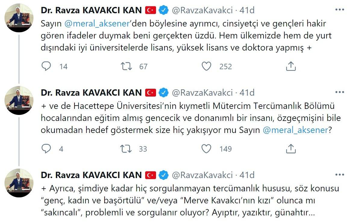 Akşener’in ayrımcı, cinsiyetçi ve gençleri hakir gören ifadelerine üzüldüğünü belirten Kavakçı Kan, “Sayın @meral_aksener’den böylesine ayrımcı, cinsiyetçi ve gençleri hakir gören ifadeler duymak beni gerçekten üzdü. Hem ülkemizde hem de yurt dışındaki iyi üniversitelerde lisans, yüksek lisans ve doktora yapmış ve de Hacettepe Üniversitesi’nin kıymetli Mütercim Tercümanlık Bölümü hocalarından eğitim almış gencecik ve donanımlı bir insanı, özgeçmişini bile okumadan hedef göstermek size hiç yakışıyor mu Sayın @meral_aksener? Ayrıca, şimdiye kadar hiç sorgulanmayan tercümanlık hususu, söz konusu “genç, kadın ve başörtülü” ve/veya “Merve Kavakcı’nın kızı” olunca mı “sakıncalı”, problemli ve sorgulanır oluyor? Ayıptır, yazıktır, günahtır…” ifadelerini kullandı.