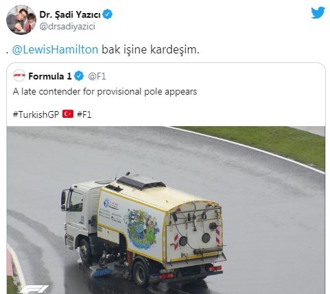 Tuzla Belediye Başkanı Dr. Şadi Yazıcı, Formula 1 organizasyonunu pistin kaygan olduğunu söyleyerek eleştiren Dünya Şampiyonu Lewis Hamilton’a cevap olarak, sosyal medya hesabından Tuzla Belediyesi'ne ait yol süpürme aracının görselini paylaşarak, 'Bak işine kardeşim' diye yazdı.