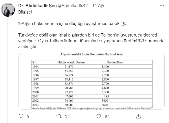 "Türkiye’de etkili olan ithal algılardan biri de Taliban’ın uyuşturucu ticareti yaptığıdır." diyen Dr. Şen, "Oysa Taliban iktidarı döneminde uyuşturucu üretimi %97 oranında azalmıştır." ifadesini kullandı. BBC tarafından hazırlanan bir habere dikkat çeken Dr. Şen, "Birleşmiş Milletlerin hazırladığı tabloda da Taliban liderliğinin haram fetvasıyla uyuşturucu üretimi dibe vurmuştur." dedi.