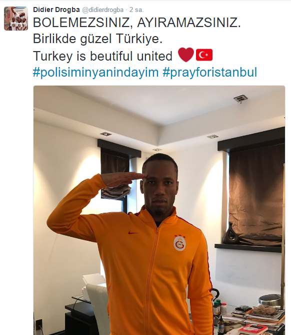 Drogba, Instagram hesabından, "Bölemezsiniz, ayıramazsınız. Birlikte güzel Türkiye" mesajını paylaşırken, "polisiminyanındayım" ve "prayforistanbul" hashtaglerini kullandı.