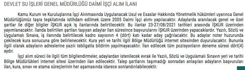 DSİ işçi alım süreci ile ilgili tüm bilgilendirmeler, adaylardan istenilecek evrak ile Yazılı, Sözlü ve Uygulamalı Sınavın yeri ve tarihi Bölge Müdürlükleri internet sitesi üzerinden ilan edilecektir. Talep şartlarını taşımadığı sonradan anlaşılan adayların başvuruları ilan, kura, sınav ve atama süreçlerinin her aşamasında idarece sonlandırılabilecektir. DSİ işçi alım kura sonuçları için tıklayın