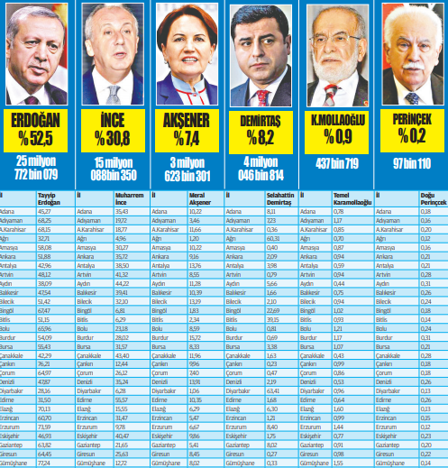 Recep Tayyip Erdoğan’ın ‘Başkan’ olarak ipi göğüslediği, AK Parti ve MHP’nin zaferle çıktığı 24 Haziran seçimlerinde liderlerin sandıklarından çıkan oylar belli oldu. Türkiye’nin ilk başkanı Erdoğan, oy kullandığı sandıktan 1’inci çıktı. Muharrem İnce ve Meral Akşener’in sandıklarının lideri de Erdoğan oldu. Hezimet yaşayan SP’nin adayı Karamolaoğlu’nun oy kullandığı sandıktan kendisine yalnızca 2 oy çıktı.