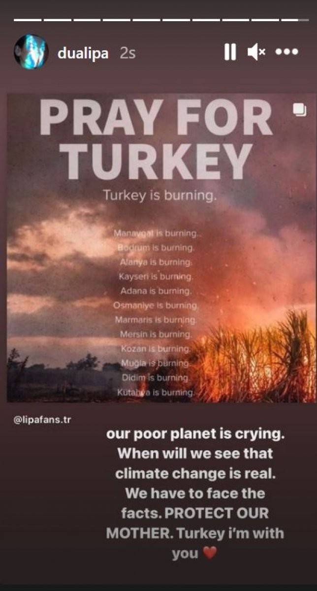 Dua Lipa, Türkiye'de çıkan orman yangınlarına ilişkin sosyal medya hesabından yaptığı paylaşıma, 'Türkiye, seninleyim' notunu düştü.