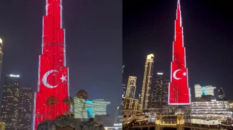 Dubai'nin sembol gökdeleni Burj Khalifa, Cumhuriyet'in kuruluşunun 102'nci yıl dönümü dolayısıyla Türk bayrağının kırmızı beyaz renklerine büründü.