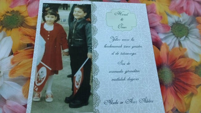 24 yaşındaki Ömer Acar, “ Biz ana sınıfında birlikteydik. O zamanlar 23 Nisanlara beraber gidiyorduk. Törenlerde bizim haberimiz yokken annesi fotoğrafımızı çekmiş. Benim hiç haberim yok bu fotoğraftan. Bu gün birlikteyiz. Çok güzel bir anı olduğu için davetiyemize koyduk. Herkes görsün istedik” dedi. Hazal Acar da,” Ana sınıfında böyle törenler oluyordu. Bizi de çift yapmışlardı Ele ele tutuştuk. Yani inanılacak gibi değil. Hatta üzerinden birkaç yıl geçtikten sonra bu resmi okula götürmüştüm. Ömer de eğlenmişti. Dalga geçmişti. Çocuk aklıyla. Ama ne oldu şimdi. Çok güzel bir anı oldu bizim için. Tekrar çıkardık. Annem onu saklamış. Davetiyede kullandık Çok mutluyuz. Bir daha bırakmayacağız o eli”