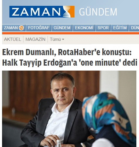 Sosyal medyada "Tel Aviv Times" olarak adlandırılmaya başlanılan Pensilvanya bülteni Zaman'ın Genel Yayın Müdürü Ekrem Dumanlı, verdiği mülakatta, Recep Tayyip Erdoğan'ın 'one minute' çıkışına atıfta bulunarak bir skandala imza attı. Dumanlı, 7 Haziran 2015 seçim sonuçları için, "Halk Tayyip Erdoğan'a 'one minute' dedi" ifadesini kullandı.