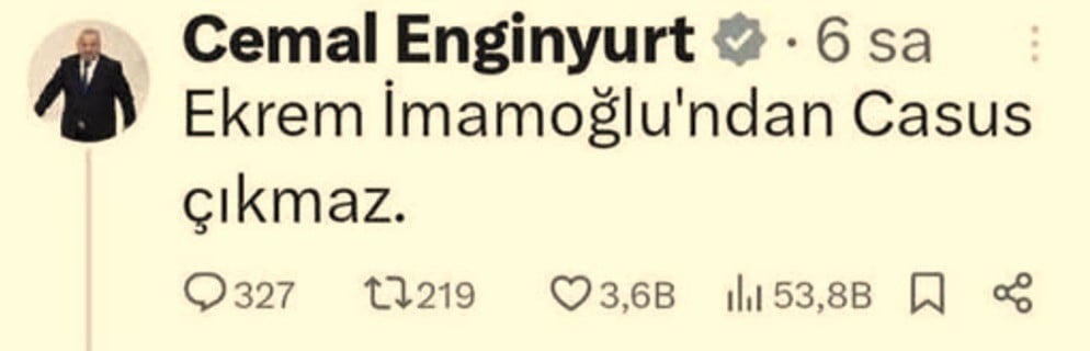 CHP İstanbul Milletvekili Cemal Enginyurt, casusluk soruşturması kapsamında tutuklama kararı verilen Ekrem İmamoğlu için, “İmamoğlu'ndan da casus olmaz” dedi. Enginyurt, MHP Milletvekili iken ise İmamoğlu için “Ekrem İmamoğlu bir projenin Türkiye'deki parçasıdır.” ifadelerini kullanmıştı.