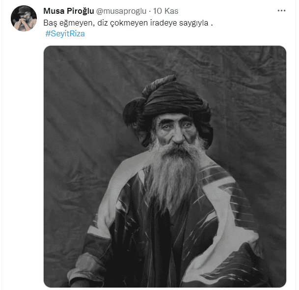 HDP İstanbul Milletvekili Musa Piroğlu, Mustafa Kemal'in ölüm yıldönümü 10 Kasım'da Twitter hesabından bir paylaşımda bulundu. Mesajına, Seyit Rıza'nın fotoğrafını ekleyen HDP'li Piroğlu, "Baş eğmeyen, diz çökmeyen iradeye saygı." dedi.