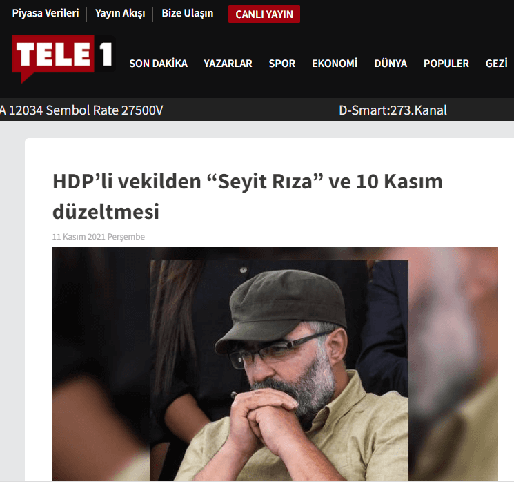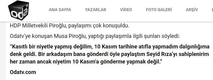 "Kasıtlı bir niyetle yapmış değilim, 10 Kasım tarihine atıfla yapmadım dalgınlığıma denk geldi. Bir arkadaşım bana gönderdi öyle paylaştım. Seyid Rıza’yı sahiplenirim her zaman ancak niyetim 10 Kasım’a gönderme yapmak değil."
