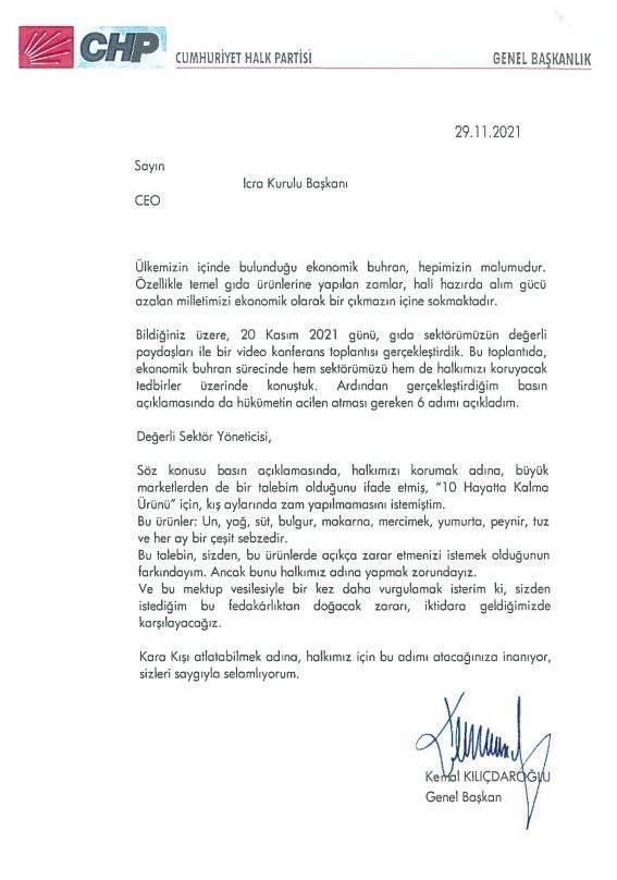 Kılıçdaroğlu, mektubunda, market sahiplerinden "10 Hayatta Kalma Ürünü" için kış aylarında zam yapılmamasını istedi.