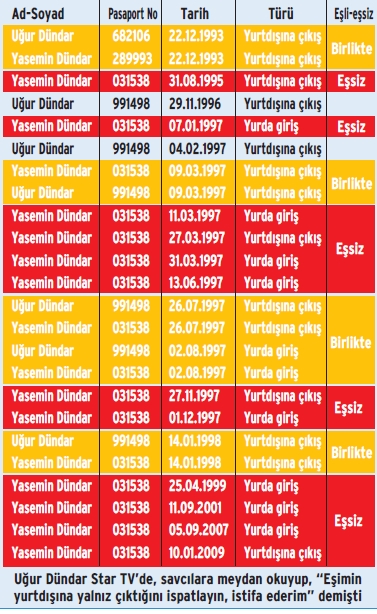 Vakit’in ele geçirdiği belgelere göre Yasemin Baradan, Uğur Dündar ile evlendikten sonra 031538 ve 760065 nolu pasaportlar ile birçok defa yanında Uğur Dündar olmadan yurt dışına çıktı.