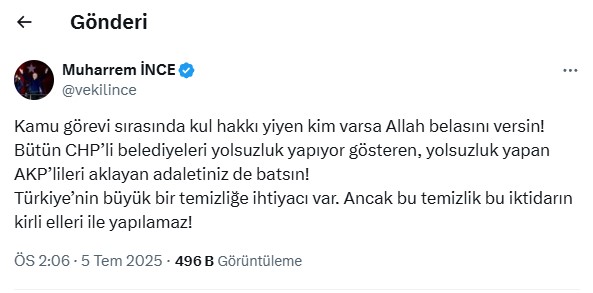 İnce paylaşımında; “Kamu görevi sırasında kul hakkı yiyen kim varsa Allah belasını versin!