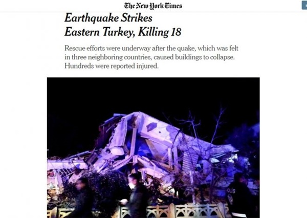 ABD’nin çok okunan gazetelerinden New York Times da depreme akşam saatlerinden itibaren internet sitesinde yer verdi.