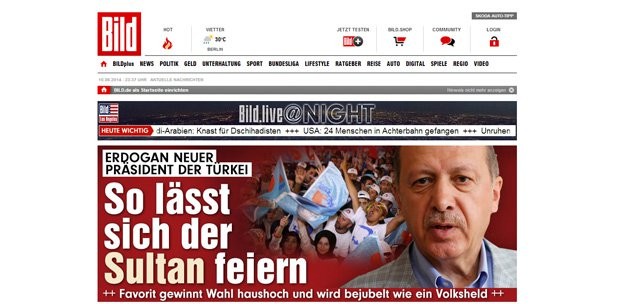 AFP’nin haberine göre Türkiye 91 yıllık Cumhuriyet tarihinde ilk kez kendi Cumhurbaşkanını seçti. Başbakan Recap Tayyip Erdoğan Başbakanlık pozisyonua gelen en güçlü lider olarak görülüyordu. Cumhurbaşkanlığı seçimlerinde favori adayın Erdoğan olduğunu yazan AFP'ye göre resmi olmayan sonuçlara göre Erdoğan oyların yüzde 54,1’ini alarak birinci oldu. AP haber ajansı da seçim sonuçlarıyla ilgili aynı sonuçları paylaşırken resmi sonuçların yarından önce açıklanamayacağını da belirtti. Reuters haber ajansı da Başbakan Erdoğan'ın resmi olmayan sonuçlara göre seçimi kazandığını ilan etti.