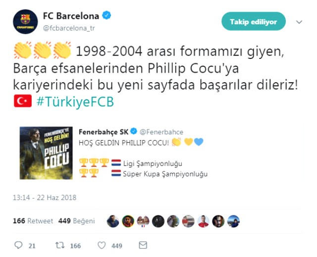 Dünya devi Barcelona, Fenerbahçe'nin teknik direktörlük görevini üstlenen Cocu'yu sosyal medya hesabı üzerinden tebrik etti.