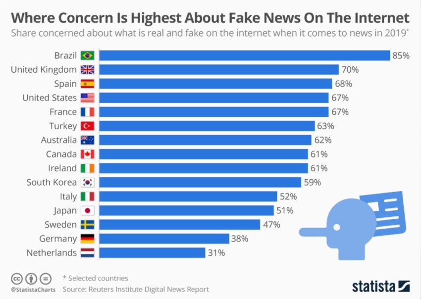 DEF'in "İnternette Yalan-Sahte Haberle İlgili En Yüksek Kaygıların Bulunduğu Yerler" başlıklı endeksi 2019 itibarıyla internet haberlerinde gerçek ve yalan konusundaki endişelerin en çok görüldüğü ülkeleri sıraladı.