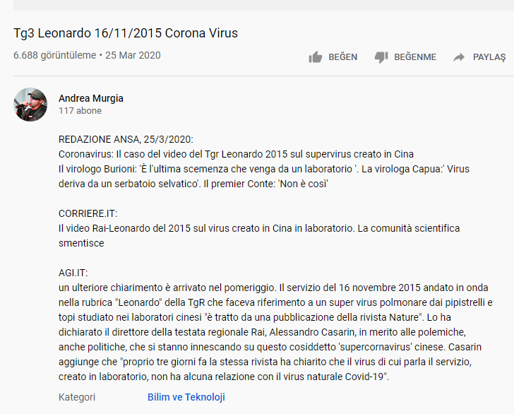 Koronavirüs dünyayı sarmaya devam ederken İtalyan televizyonlarına ait 2015’te yayınlanan bir video tekrar gündeme geldi. Çin’de bir laboratuvarda üretildiği öne sürülen bir virüs 2015 Rai-Leonardo videosunda ‘Bilim camiası reddediyor’ gibi imalarla karşılandı. İtalyan viroloji uzmanı profesör Burioni, 'Bir laboratuvardan gelen son saçmalık' olarak durumu değerlendirmişti.
