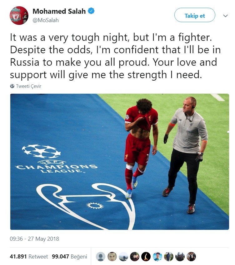İşte Salah açıklamasında "Çok zor bir geceydi ama ben bir savaşçıyım. Tüm zorluklara rağmen, sizi gururlandırmak için Rusya'da olacağıma eminim. Sevginiz ve desteğiniz bana ihtiyacım olan gücü verecek." dedi.