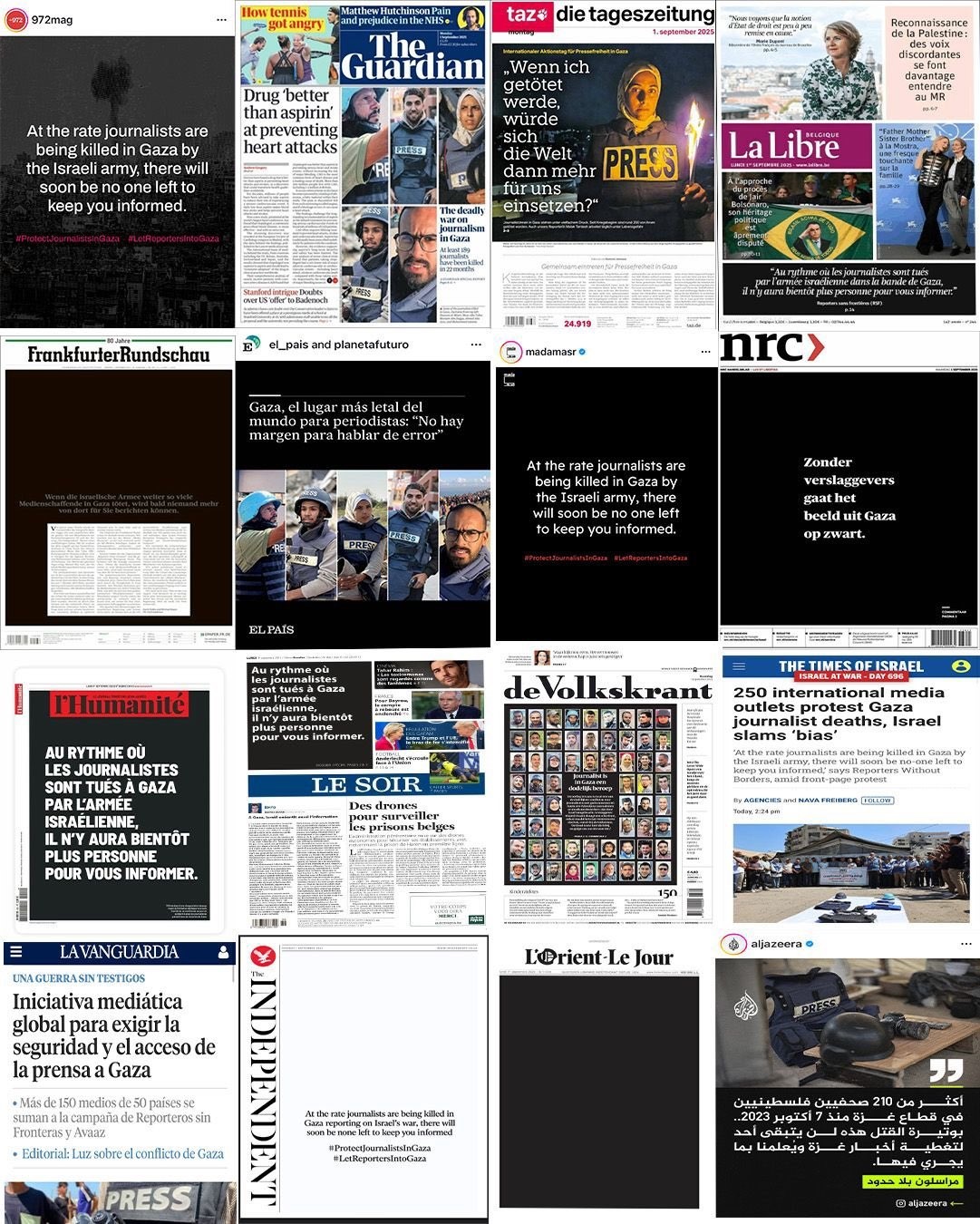 70’in üzerinde ülkeden 250’den fazla medya kuruluşu, terörist İsrail’in Gazze’de gazetecileri hedef almasını protesto için eş zamanlı eylem yaptı. Gazeteler ilk sayfalarını, internet siteleri ise ana sayfalarını karartarak yayınlarını durdurdu.