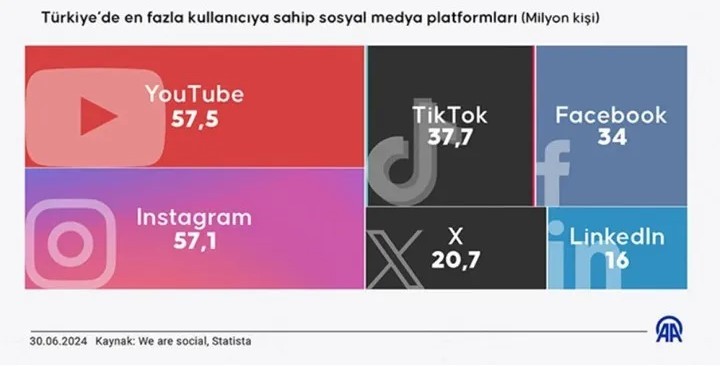 Rapora göre, Türkiye'de en fazla kullanıcıya 57 milyon 500 bin ile YouTube sahip. Instagam, 57 milyon 100 bin kullanıcıyla YouTube'un hemen peşinden geliyor. TikTok, 37 milyon 700 bin kullanıcıyla Türkiye'de 3'üncü, Facebook 34 milyonla 4'üncü, X 20 milyon 670 bin kullanıcıyla 5'inci, LinkedIn ise 16 milyon kullanıcıyla 6'ncı sırada yer alıyor.