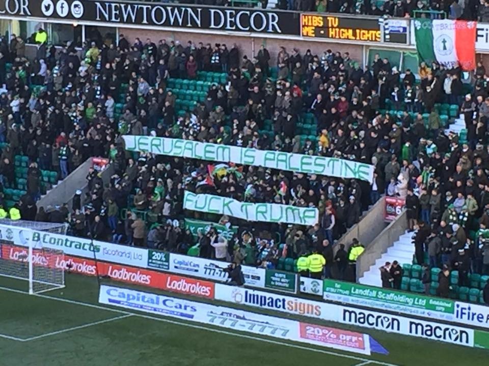 İskoç ekibi Celtic'te taraftarlar Hibernian'la oynayacakları maç öncesinde kendilerine ayrılan tribünlere "Kudüs Filistin'indir" pankartları açtı.