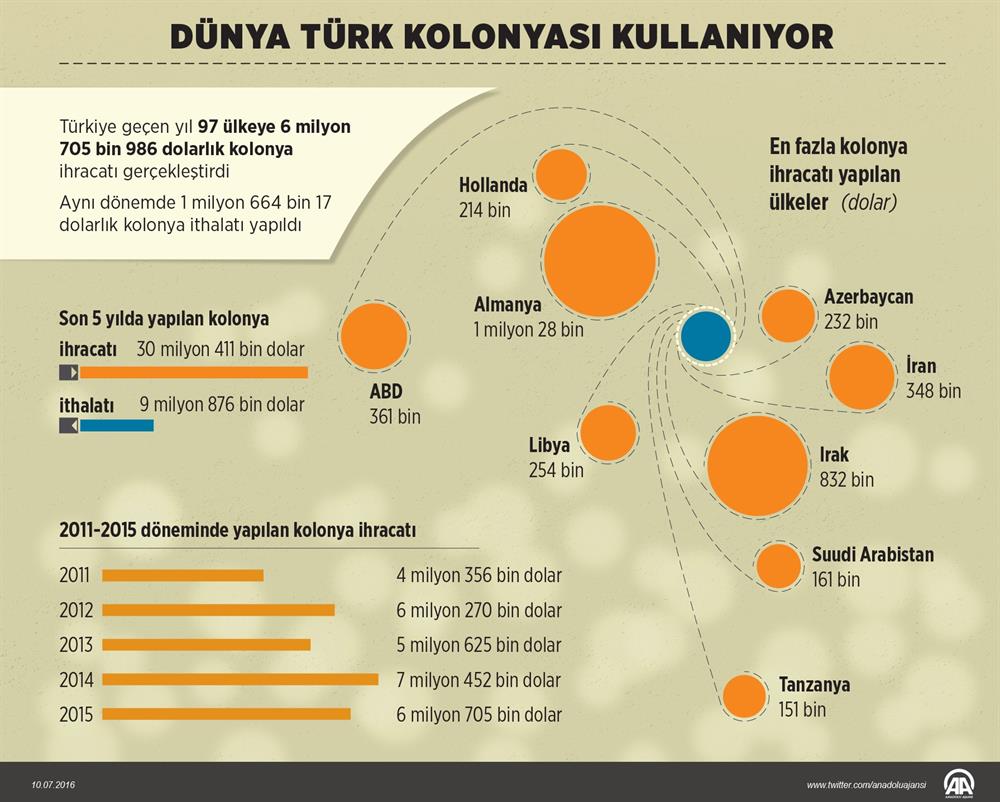Son 5 yıldaki kolonya ihracatı ise 30 milyon 411 bin dolar oldu. Türkiye 2011 yılında 4 milyon 356 bin, 2012'de 6 milyon 270 bin, 2013'te 5 milyon 625 bin, 2014'te 7 milyon 452 bin, geçen yıl da 6 milyon 705 bin dolarlık kolonya ihracatı gerçekleştirdi. Kolonya ithalatı ise son 5 yılda 9 milyon 876 bin dolar olarak hesaplandı.