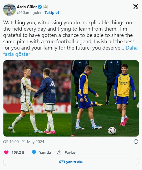 Bu haberin ardından, milli futbolcumuz Arda Güler, sosyal medya hesabından Kroos'a yönelik bir veda mesajı yayınladı.