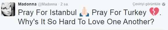 Dünyaca ünlü şarkıcı Madonna, 1.22 milyon takipçisi bulunan resmi Twitter hesabından İstanbul Atatürk Havalimanı saldırısı sonrası paylaşımda bulundu. Madonna, 'İstanbul için, Türkiye için dua edin. Neden bir başkasını sevmek bu kadar zor?' yazdı.