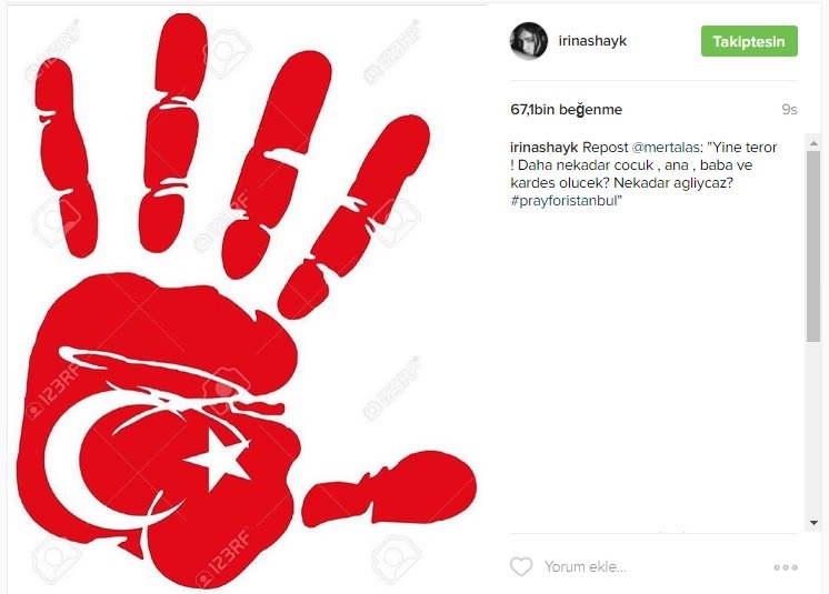 Rus model Irına Shayk da Instagram hesabından Amerika'nın en ünlü fotoğrafçılarından Mert Alaş'ın paylaşımını tekrarlardı. Mert Alaş ise o paylaşımında, "Yine teror ! Daha nekadar cocuk , ana , baba ve kardes olucek? Nekadar agliycaz? #prayforistanbul" ifadelerini kullandı.