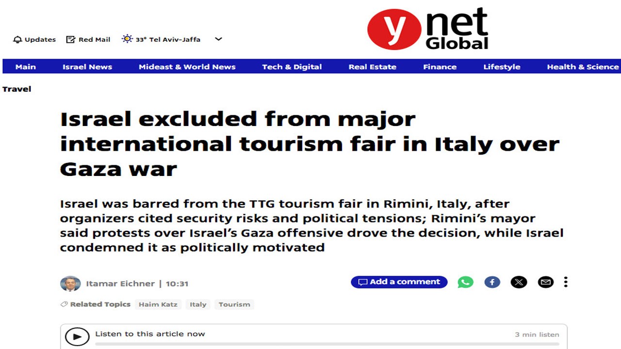 Dünyanın önde gelen turizm fuarlarından biri olan Rimini'deki TTG Seyahat Deneyimi organizatörleri, siyonist devletin katılım koşullarını artık karşılamadığını açıklamasının ardından İsrail'in bu fuara katılımı yasaklandı.