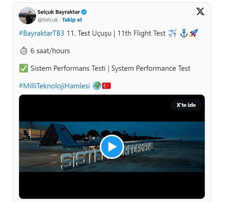 Baykar Yönetim Kurulu Başkanı ve Teknoloji Lideri Selçuk Bayraktar, sosyal medya hesabından yaptığı paylaşımda, Bayraktar TB3 SİHA'nın Sistem Performans Testi kapsamında 6 saat havada kaldığını ve 11'inci uçuşunu başarıyla tamamladığını duyurdu.