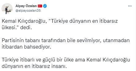 Sosyal medya hesabından Kılıçdaroğlu’nun açıklamalarına tepki gösteren AK Parti İzmir Milletvekili Alpay Özalan, "Kemal Kılıçdaroğlu, ‘Türkiye dünyanın en itibarsız ülkesi’ dedi. Partisinin tabanı tarafından bile sevilmiyor, utanmadan itibardan bahsediyor. Türkiye itibarlı ve güçlü bir ülke ama Kemal Kılıçdaroğlu dünyanın en itibarsız insanı" ifadelerini kullandı.