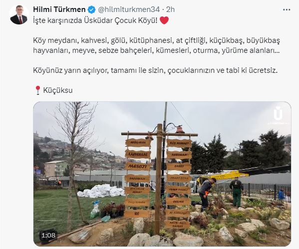 "İşte karşınızda Üsküdar Çocuk Köyü" diyerek sosyal medya hesabından önceki gün paylaşım yapan Hilmi Türkmen, "Köy meydanı, kahvesi, gölü, kütüphanesi, at çiftliği, küçükbaş, büyükbaş hayvanları, meyve, sebze bahçeleri, kümesleri, oturma, yürüme alanları… Köyünüz yarın açılıyor, tamamı ile sizin, çocuklarınızın ve tabi ki ücretsiz." ifadelerini kullandı.