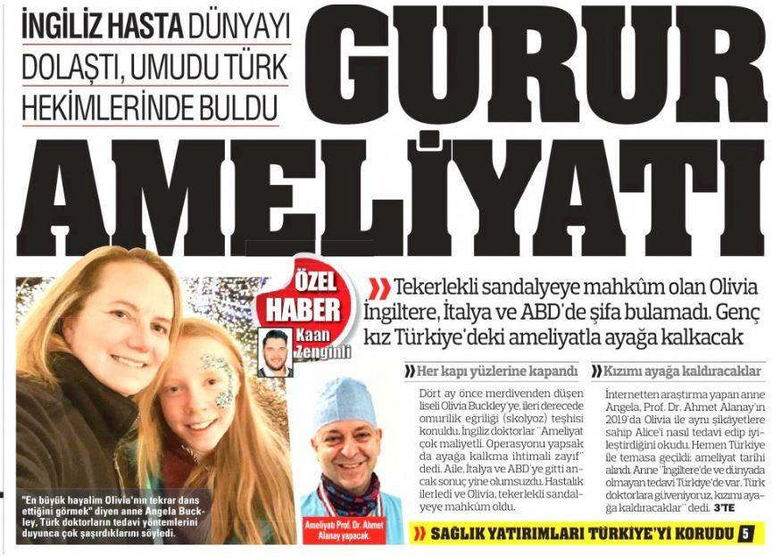 Eskiden hastalıkların çaresini Avrupa ülkelerinde ararken, şimdi Avrupalılar Türkiye’nin kapısını çalıyor. Özellikle beyin ve omurilik gibi yüksek teknoloji ve dikkat isteyen operasyonlar ülkemizde başarıyla gerçekleştiriliyor. Son dönemde İngiliz basını, merdivenden düşerek tekerlekli sandalyeye mahkum olan Olivia Buckley isimli kızın hikâyesini konuşuyor. Avrupa ve ABD dâhil birçok ülkeyi gezen Olivia’nın ailesi çözümü Türkiye’de buluyor.