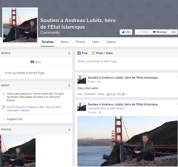 Ana pilotun kokpitten çıktığı sırada kapıyı kilitleyerek uçağı baş aşağı düşürdüğü açıklanan pilot adına açılan bir sayfanın isminin 'IŞİD'in kahramanı Anders Lubitz'e destek' olarak seçilmesi kafaları karıştırdı.