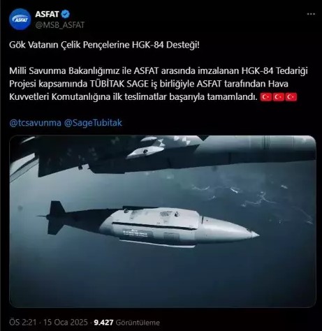 ASFAT'ın sosyal medya hesabından, teslimata ilişkin yapılan açıklamada, "Gök vatanın çelik pençelerine HGK-84 desteği. Milli Savunma Bakanlığımız ile ASFAT arasında imzalanan HGK-84 Tedariği Projesi kapsamında TÜBİTAK SAGE iş birliğiyle ASFAT tarafından Hava Kuvvetleri Komutanlığına ilk teslimatlar başarıyla tamamlandı" denildi.